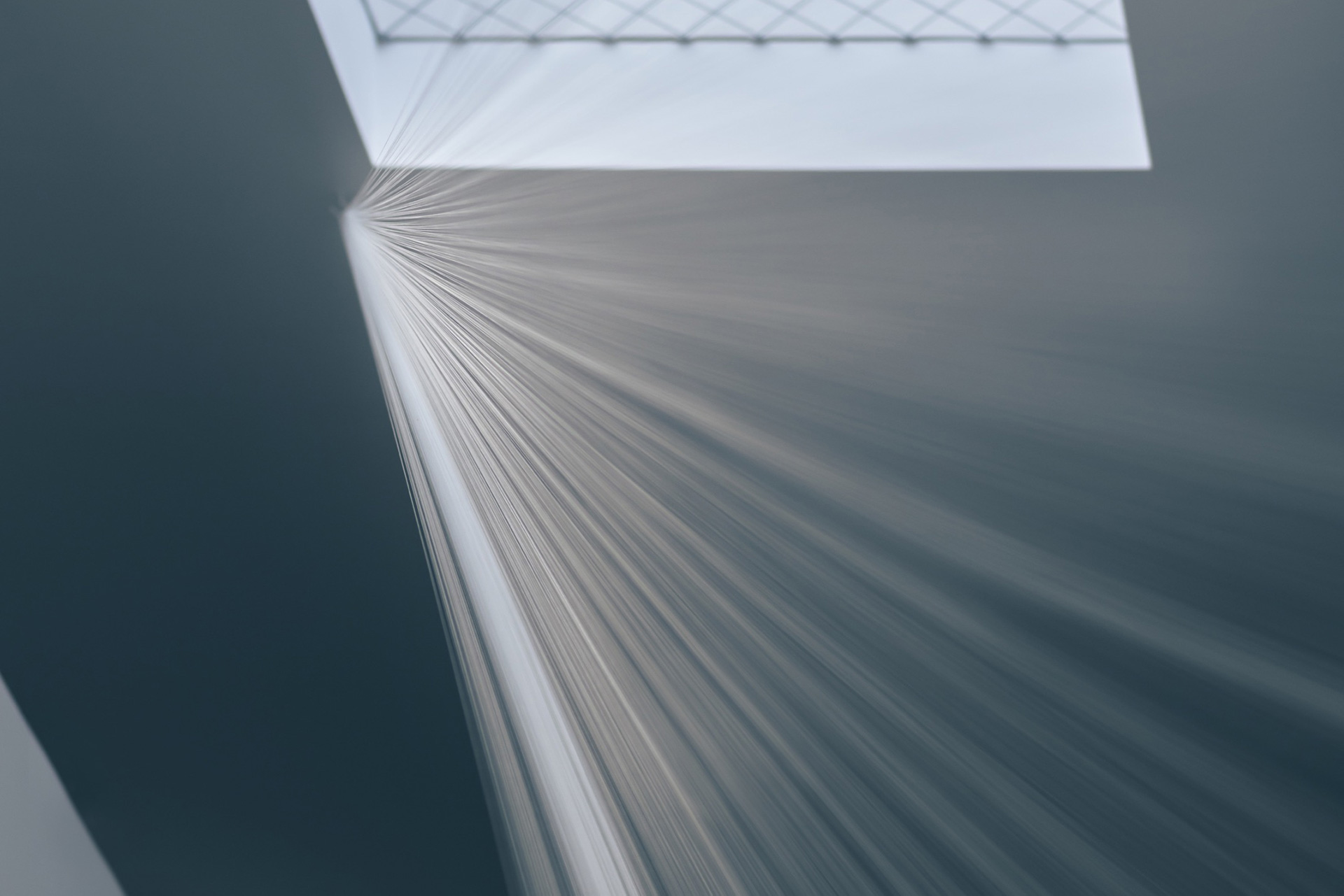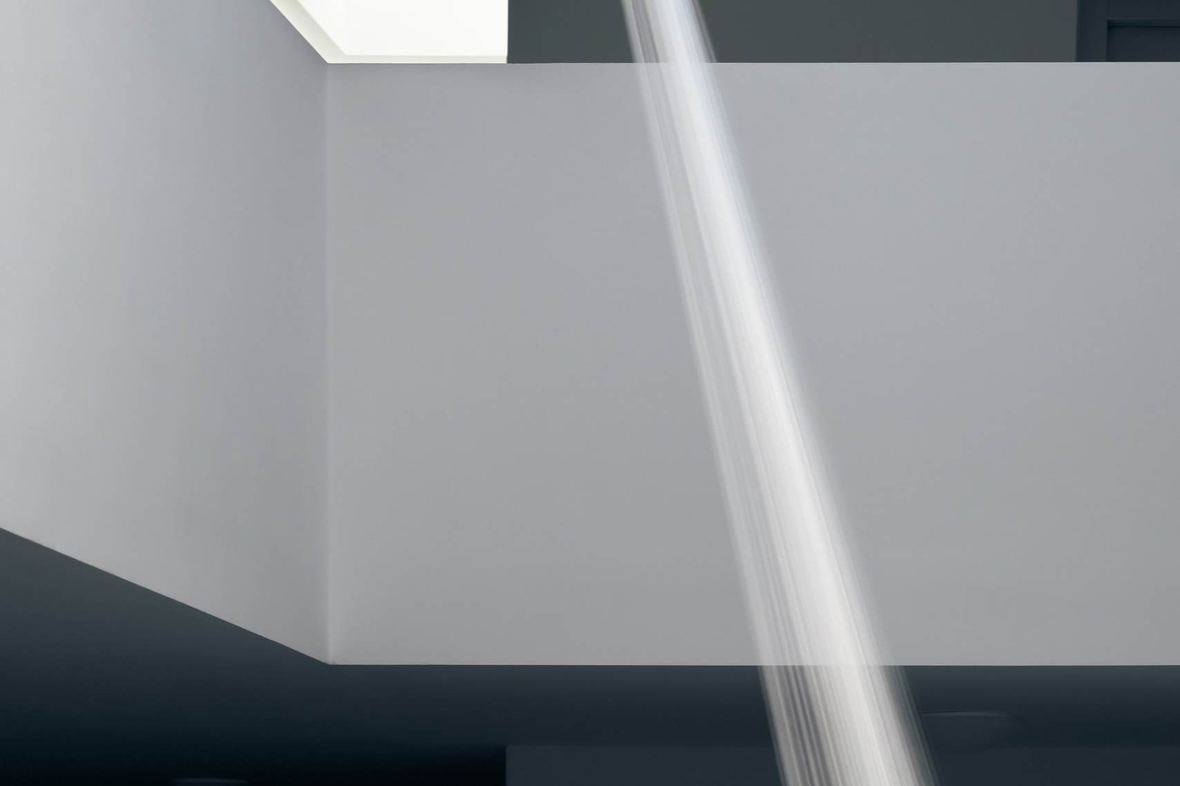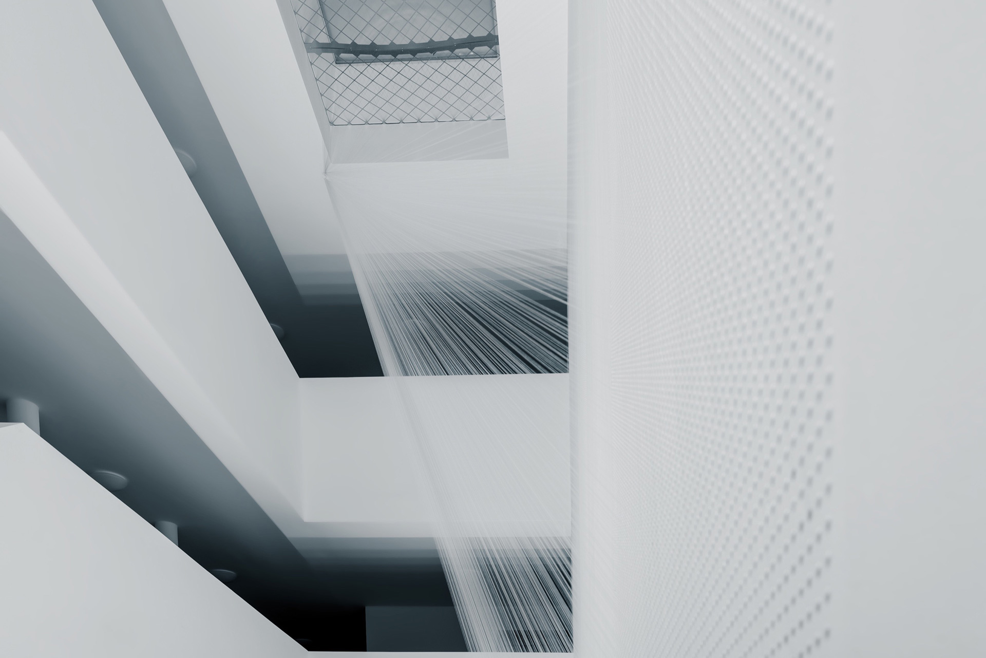 Für das Atrium der Wohnanlage in Absam entwickelte Elke Maier eine Rauminstallation, die sich in ihrer Struktur spezifisch in die architektonischen Gegebenheiten vor Ort einfügt. Die »Lichtharfe« wird von der Künstlerin selbst als visuelle Skulptur bezeichnet und besteht aus unzähligen Fäden von feinster, weißer Nähseide, welche Maier manuell über mehrere Wochen im Atrium zur Installation gezogen und gesponnen hat. Die Nähseide ist in ihrer Materialität hauchdünn und oszilliert je nach Lichteinfall zwischen Unsichtbarkeit und Sichtbarkeit. Gleichzeitig evoziert die Vielzahl der weißen Fäden dementsprechend eine Vielzahl an Reflexionen, welche das Spektrum des einfallenden Sonnenlichts in seiner Gesamtheit reflektieren und infolge einen transluzenten Zwischenraum erschaffen, der sich durch die Interaktion mit Licht in seiner (Un-)Sichtbarkeit plötzlich jeglicher Materialität zu entziehen scheint, beinahe schon projiziert wirkt, und in seiner Formensprache an Lichtatmosphären in Kathedralen erinnert.