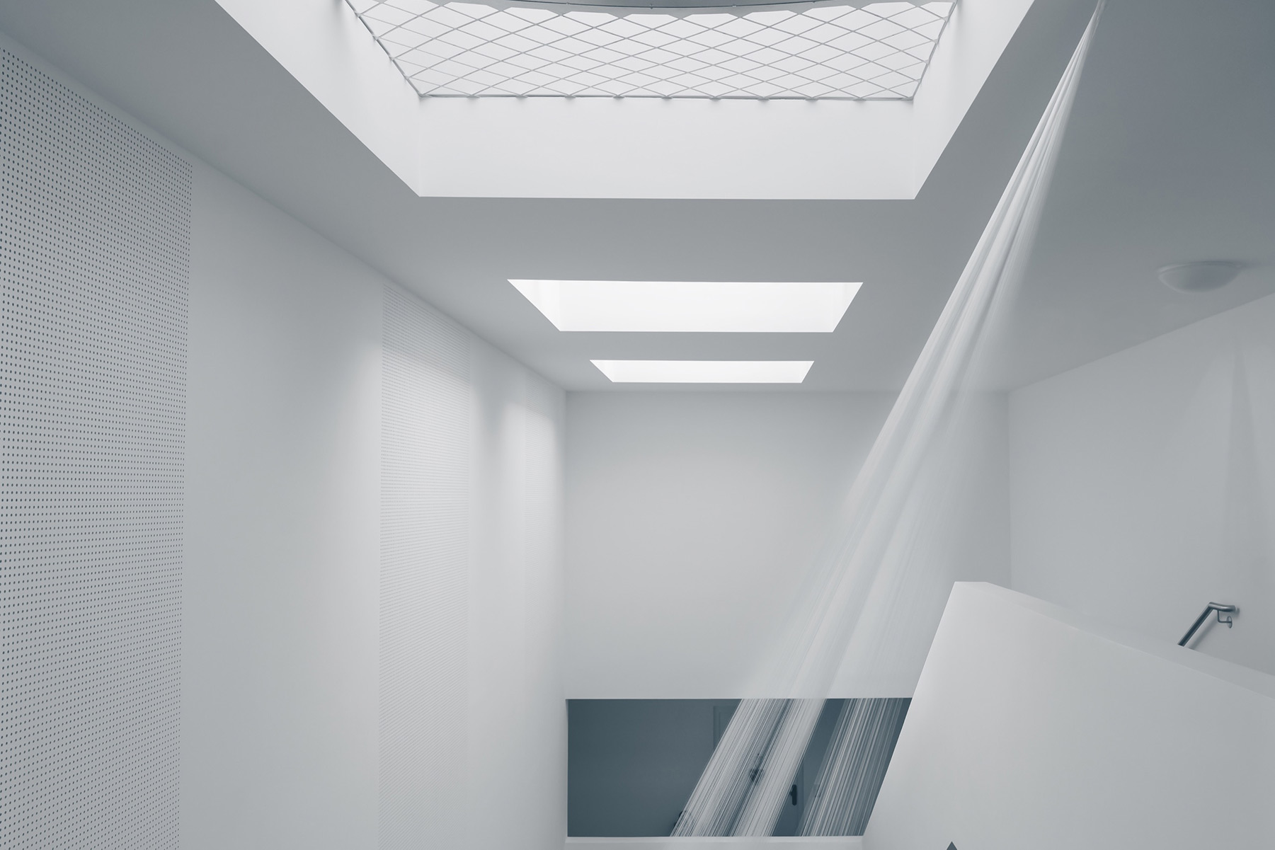 Für das Atrium der Wohnanlage in Absam entwickelte Elke Maier eine Rauminstallation, die sich in ihrer Struktur spezifisch in die architektonischen Gegebenheiten vor Ort einfügt.