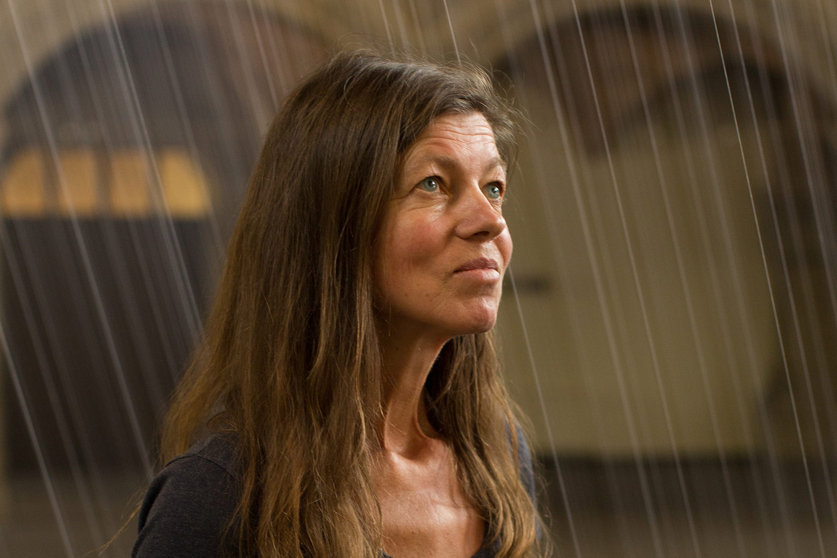 Für die Künstlerin gibt sich die Arbeit erst im Prozess zu erkennen: zum einen zwischen materieller Beschaffenheit und Lichtsituation, zum anderen in der Dependenz mit dem Betrachter, der je nach Blickwinkel und der Position im Atrium die Installation visuell immer wieder neu und verwandelt erfährt.