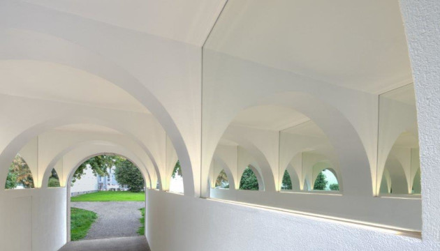 Eva Schlegels Projekt schafft mit Spiegeln im oberen Bereich der Seitenwände eines langen Durchgangs eine Bogenkonstruktion: Es entsteht ein eindrucksvoller, riesiger Raum, vergleichbar einem wunderbaren Palast.
