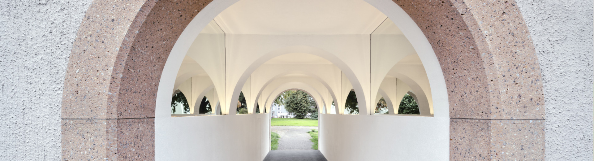 Eva Schlegels Projekt ist ein in-situ-Werk für einen langen Durchgang in der Wohnanlage der Neuen Heimat Tirol. Im oberen Bereich der Seitenwände der Passage werden Spiegel montiert, sodass sich die Bogenkonstruktionen unendlich spiegeln. Es entsteht ein eindrucksvoller, riesiger Raum, vergleichbar einem wunderbaren Palast. Der Titel des Werkes, ,,ln den Palästen der Erinnerung“, nimmt Bezug auf das gleichnamige Buch des Wissenschaftsjournalisten und Autors, George Johnson, der in seinem Buch eine Phänomenologie der heutigen Neurowissenschaften entwirft. Der Untertitel lautet Wie die Welt im Kopf entsteht. Es geht um den Raum als eine Kategorie des Denkens, um die Beziehungen zwischen dem materiellen, erfahrbaren architektonischen Raum und seine Transformation in einen immateriellen Denkraum. Eva Schlegel beschäftigt sich in ihren Installationen oft mit Fragen existentieller Bedingungen: Schwerkraft und Leichtigkeit, Stofflichkeit und lmmaterialität, Wirklichkeit und Wahrnehmung. Deshalb hat sie eine Vorliebe für bestimmte Materialien, die diese Ambiguität konstitutiv verkörpern. In diesem Fall ist es der Spiegel. Einerseits ist der Spiegel ein reales Objekt, physikalisch gesehen eine sehr glatte reflektierende Fläche, bei der ein Abbild der realen Umgebung entsteht. Die Gewölbe der Passage sind ein schöner architektonischer Kontrapunkt, den die Künstlerin durch Hinzufügen zweier weiterer Bögen noch intensiviert. Durch die intendierte Unendlichkeit des Raumes ist zum einen die Frage nach der Wirklichkeit präsent, zum anderen öffnet sich der Raum selbst ins Unermessliche. Dieser Raum ist nicht greifbar, er verändert sich beim Durchgehen. Die helle Beleuchtung und die Weite des Raumes verleihen der Passage eine angenehme Atmosphäre. In diesem von äußeren Einflüssen gleichsam losgelösten Raum entsteht ein Raum jenseits der sichtbaren realen Architektur, ein rein vorgestellter Raum. Die Welt, wie Johnson sagt, entsteht im Kopf.