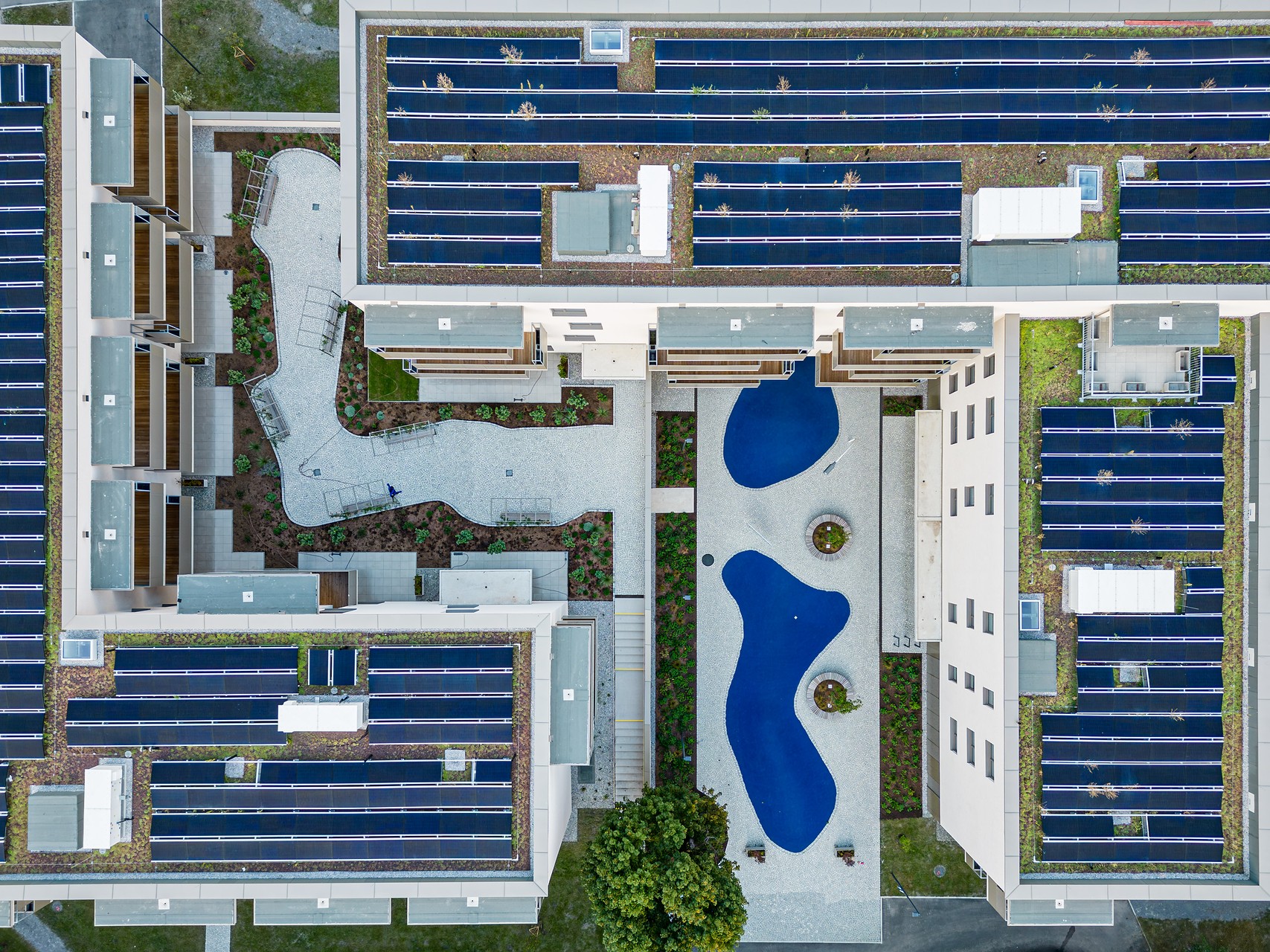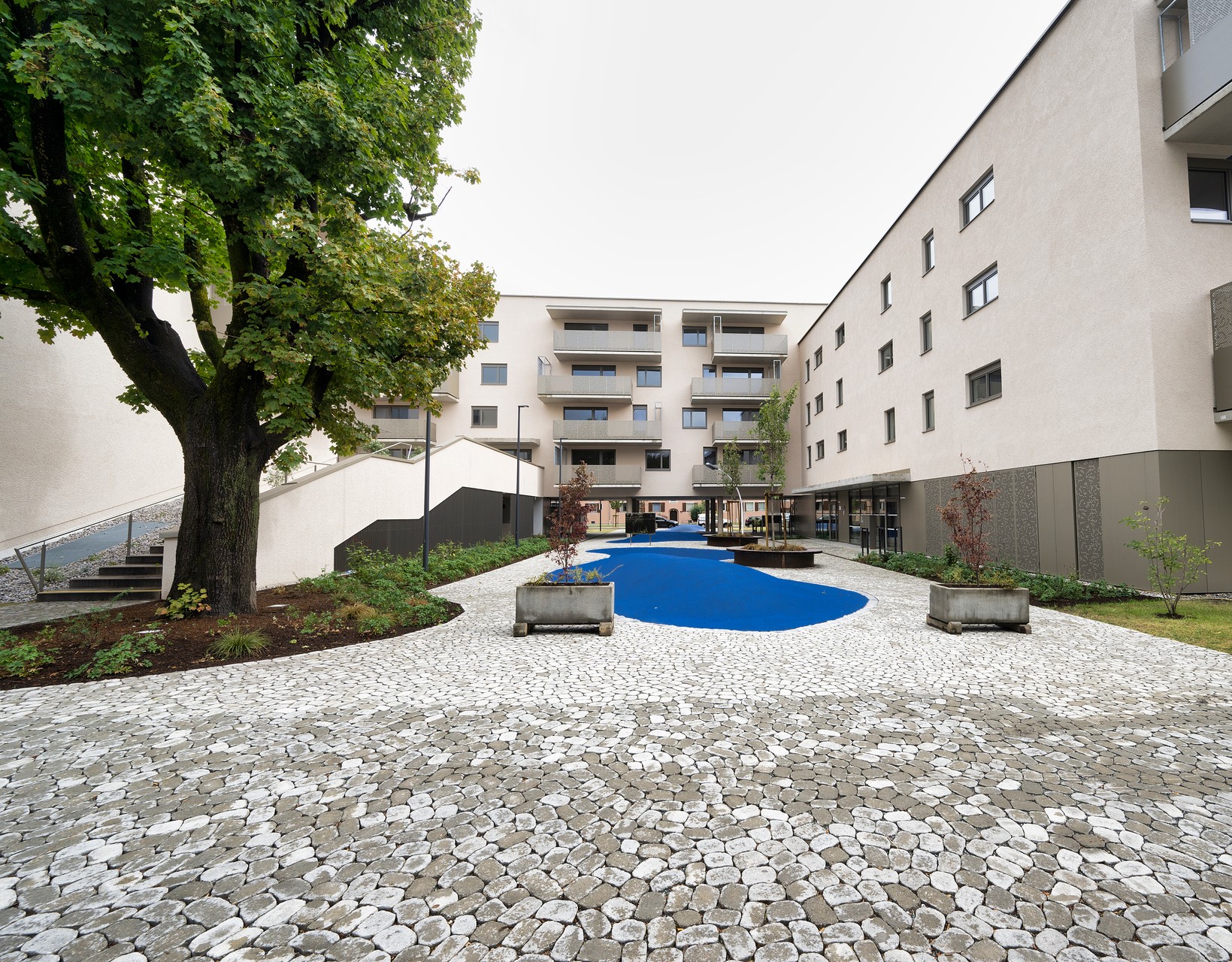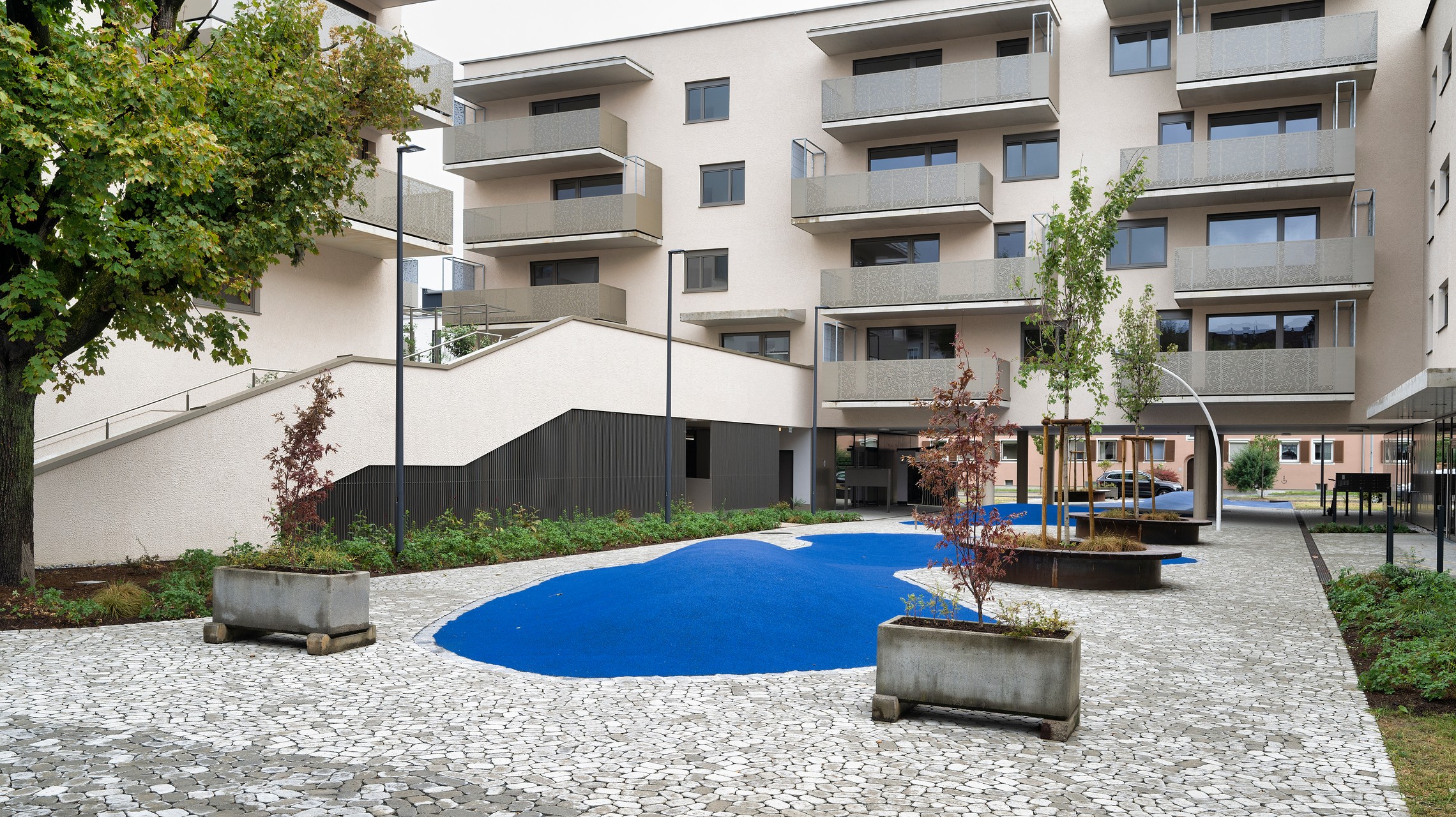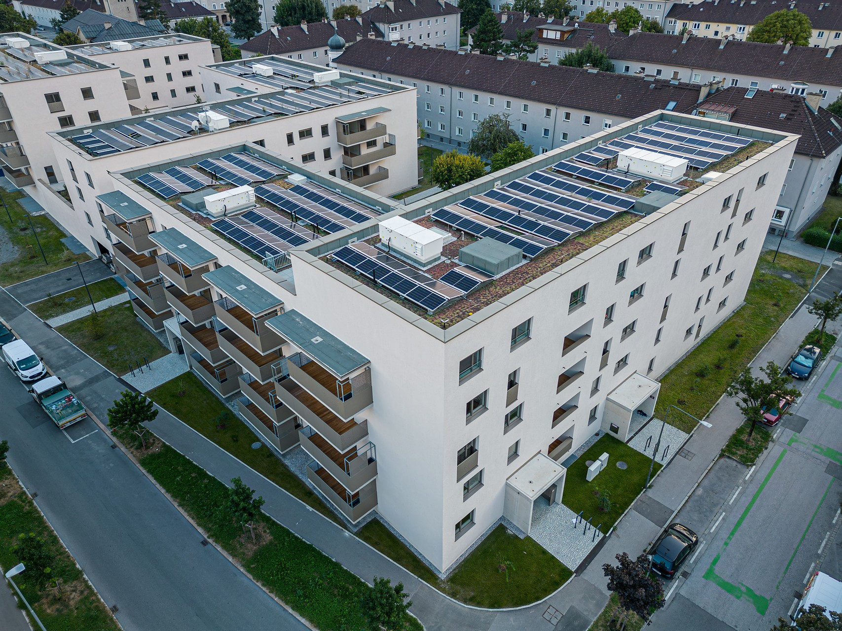 Für überschaubare Energiekosten sorgen drei PV-Anlagen am Dach mit einer Gesamtleistung von 235 Kilowatt-Peak. Der überschüssige Strom wird über ein Mieterstrommodell auf die teilnehmenden Haushalte aufgeteilt. Großzügige Grünflächen und ein zentraler Treffpunkt mit einem innovativ gestalteten Spielplatz im Innenhof tragen zusätzlich zu einer hohen Wohn- und Lebensqualität bei.