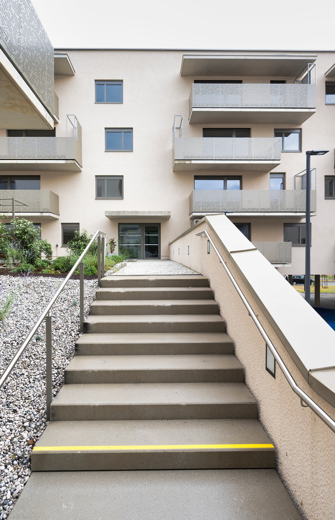 Die Gebäudehöhe ist mit 4 und 5 oberirdischen Geschoßen festgelegt. Die geplanten Wohnungen sind nach Osten, Süden und Westen ausgerichtet. Jeder Wohnung ist ein Balkon mit Pflanzentrog und Rankgerüst vorgelagert.