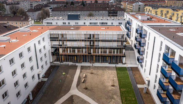 Die großzügig angelegten Innenhöfe bieten zudem ausreichend Platz für Spiel- und Erholungsflächen. Besonderes Highlight ist die Dachterrasse im fünften Stock mit Liegestühlen und Hochbeeten zum Urban Gardening.