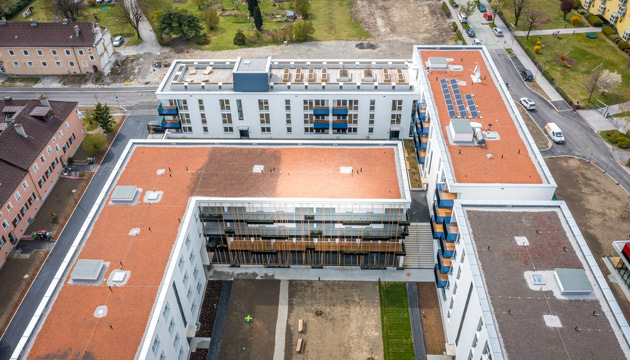 Die Wärme- und Energieversorgung erfolgt klimafreundlich über einen Fernwärmeanschluss und eine Photovoltaikanlage am Dach. Die Komfortlüftung versorgt die Wohnungen kontinuierlich mit frischer Luft.