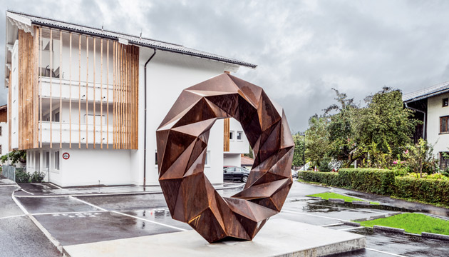 Die direkt neben der Wohnanlage platzierte Skulptur „TWIST 2020“ stammt vom bekannten Kundler Künstler Peter Sandbichler.