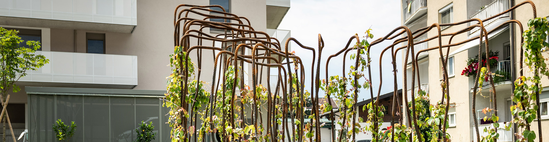 Die freistehenden Bogen aus (Tor)Stahl variieren in ihrer Höhe und Breite und sind über ein unsichtbares Fundament fest im Boden verankert. Sie verdichten sich, Blickachsen werden gebrochen, Raum öffnet sich. Es entsteht eine Hybridform aus Tunnel und Abbau. An einzelnen Bögen wird wilder Wein gepflanzt. Damit wird das Grundgerüst des Objekts im Laufe der Zeit überwachsen, überwuchert, es verändert seine Farbe mit den Jahreszeiten und entzieht sich zunehmend den Blicken.