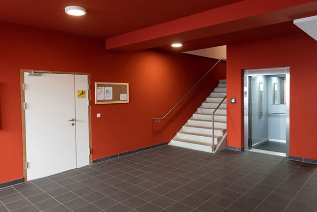 Über ein großzügig angelegtes Foyer im Erdgeschoss wird u.a. das nördlich ausgerichtete Künstleratelier erschlossen. Die Stube (Gemeinschaftsraum) grenzt über ein flexibles Wandsystem an das Atelier und bei Bedarf können die beiden Räume zu einem großen Raum verbunden werden. Das Büro und eine WC‐Anlage mit barrierefreien WC befinden sich ebenfalls im Erdgeschoss.