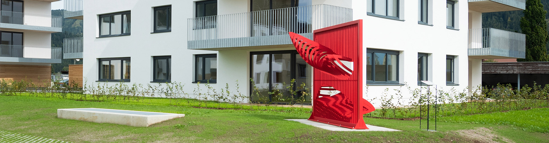 Friedrich Biedermann entwickelte für die Wohnanlage am Oberhofenweg in St. Johann in Tirol die aus rot lackierten Edelstahlbändern bestehende Außeninstallation „Curtain Lighter“.