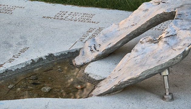 Das derzeitige Volumen des Larstigferners sowie die abgeschmolzene Zunge als Negativvolumen werden in der skulpturalen Intervention sichtbar. Die Messdaten der weiteren fünf Ferner sind auf der Sockelplatte verzeichnet.