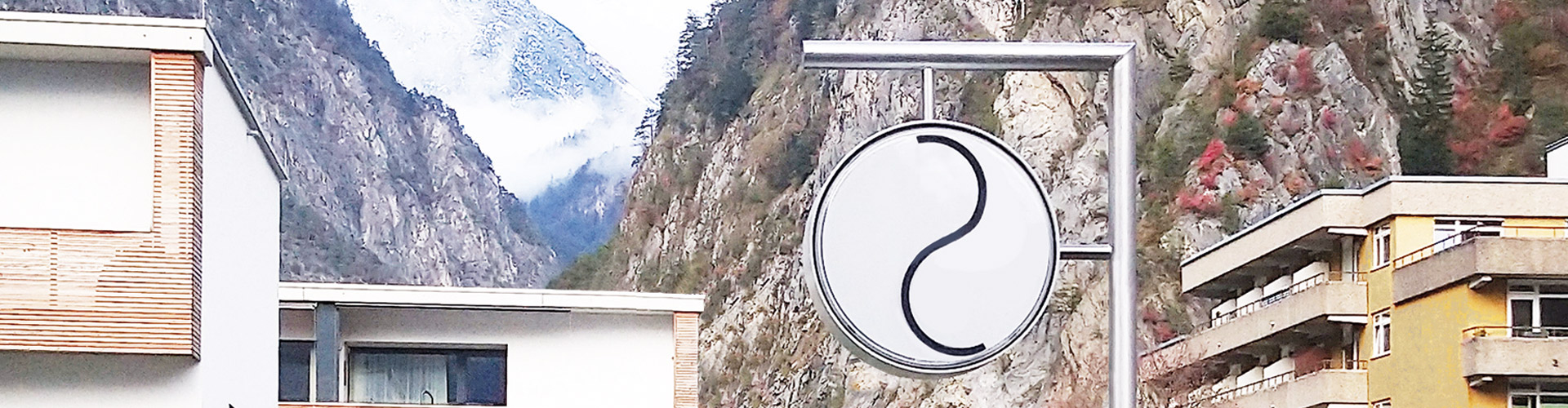 Es ist eine Uhr, aber die exakte Zeitangabe steht nicht im Vordergrund. Vom Uhrzeitzwang befreit, regt das Kunstobjekt an, die Zeit durch das Entstehen und Vergehen von unterschiedlichen Zeichen anders wahrzunehmen: Berg, Schnabel, Horn, Beistrich … zwei Mal in 24 Stunden taucht für eine kurze Weile der YinYang-Moment auf.