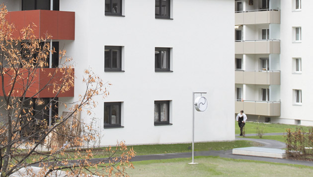Das Uhrenobjekt charakterisiert die Wohnanlage, schafft Identifikation und wird gleichsam zu ihrem Logo. Im ursprünglichen Symbol werden durch die Zweifarbigkeit die Gegensätze betont. Die YinYang-Uhr verzichtet darauf.