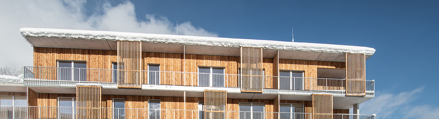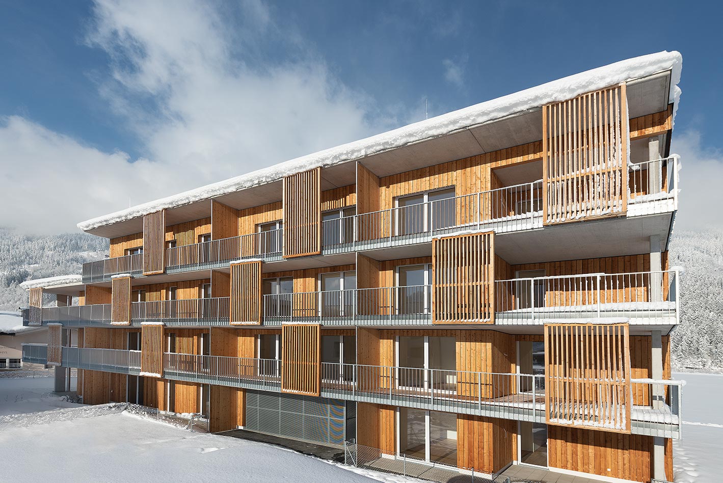 Das markante Wohngebäude wurde in Holz-Beton-Hybridbauweise mit einer Lärchenfassade errichtet. Die Wohneinheiten verteilen sich über vier Ebenen und sind nach Süden orientiert. Eine Komfortlüftung sorgt für ein angenehmes Raumklima. Im Untergeschoß ist die Tiefgarage mit 19 Stellplätzen sowie sämtlichen Nebenräume untergebracht.
